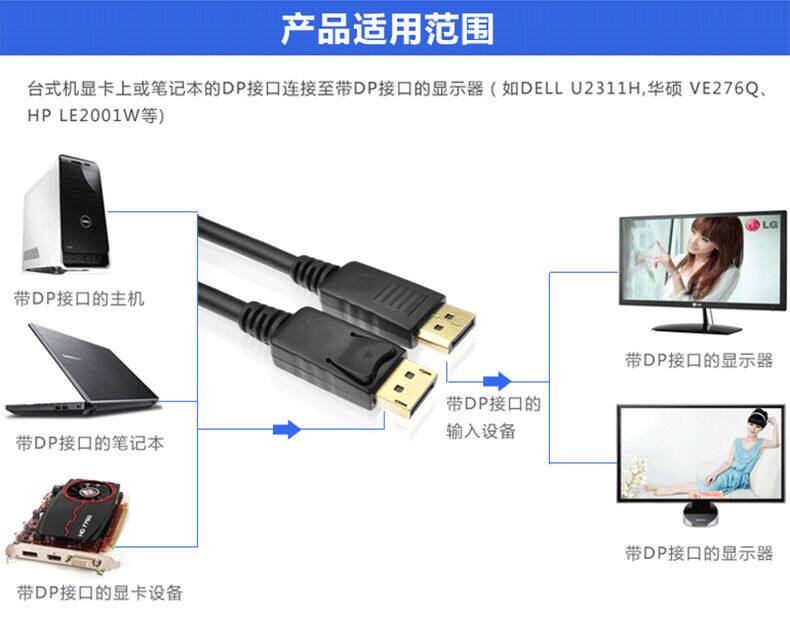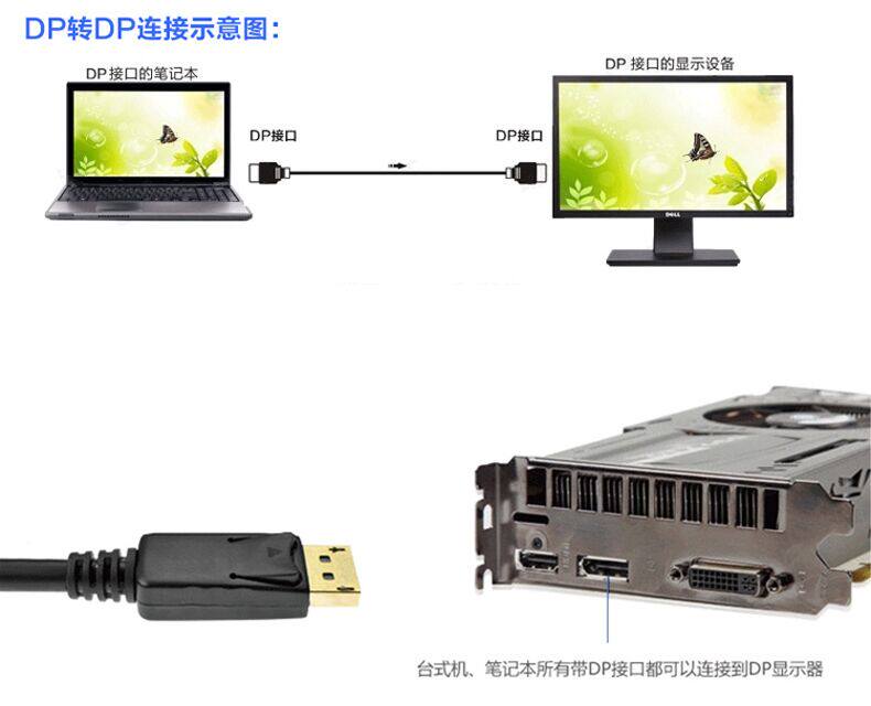 名称:DisplayPort转DisplayPort连接线线长:1.8米接头:DP转DP 镀金 抗氧化线材:采用优质的无氧铜为导体(加强信号传输),PVC外层,材质好,不易氧化适用:带DP口的所有台式机/笔记本等设备与DP口的显示器或投影仪等显示设备连接。方便:无损信号,即插即用效果:高度保真,画面细腻 逼真产品优点:支持热插拔,即插即用,使用方便